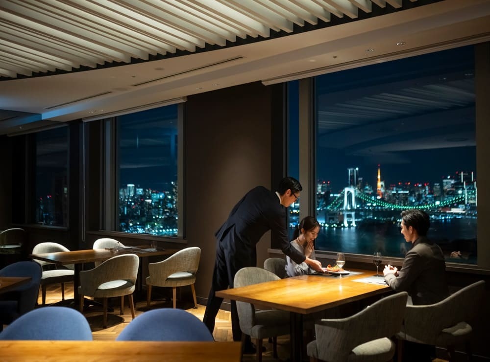 レインボーブリッジが見える客室や大井ふ頭のオレンジ色に染まる夜景など、都心の高層ビルの合間から見える景色とは異なるお台場ならではの解放感と躍動感にあふれる眺望が広がります。