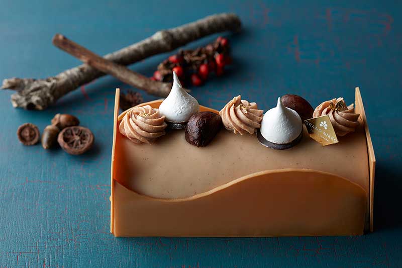 マロンのムースの中に詰め込んだスパイスの一種であるトンカ豆のブリュレとミルクチョコのクリームを香り高いマロンの生地で包み、つやのあるマロンのグラサージュが美しいブッシュドノエルです。