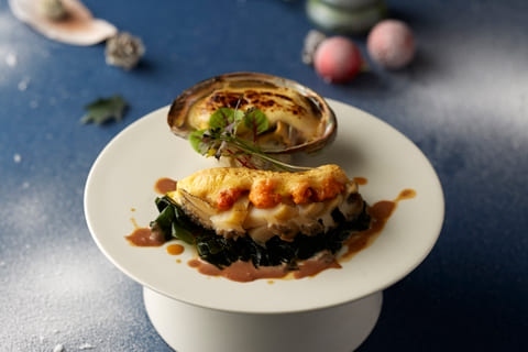 さらに、スライスしたトリュフを贅沢にあしらい、芳醇な香りが立つ「和牛サーロインのグリル トリュフとソーテルヌのソース」や、肉厚なエゾ鮑の食感とウニの濃厚な旨味が調和した「エゾ鮑の雲丹黄金焼と肝のグラタン」などもご用意しました。