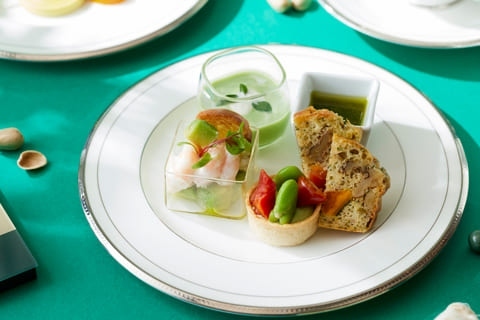 セイボリーでは、お口直しにぴったりの塩味の効いた「ケークサレ」や、グリンピースのスープにミントを添えた爽やかな味わいの「サンジェルマンミント」、濃厚なアボカドとエビがマッチした「エビアボカド」など、グリーンカラーで統一したセイボリーの数々をお楽しみいただけます。