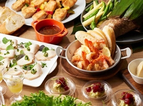 お馴染みのハワイアンシーフード料理「ガーリックシュリンプ」や、さっぱりとした味わいの「ロミロミサーモン」「アヒポキ」を揃えています。またバナナの葉に包みしっとりふっくらと蒸し上げた「豚肩ロースのラウラウ風バナナの葉包み」や、白身魚マヒマヒ(シイラ)と甘くて香ばしいパイナップルの焦がしバターソースを合わせた「マヒマヒのムニエル パンフライパイナップルの焦がしバター醤油入りフォンドヴォーソース」など、日本ではなかなか味わうことのできない本場の味もお楽しみいただけます。