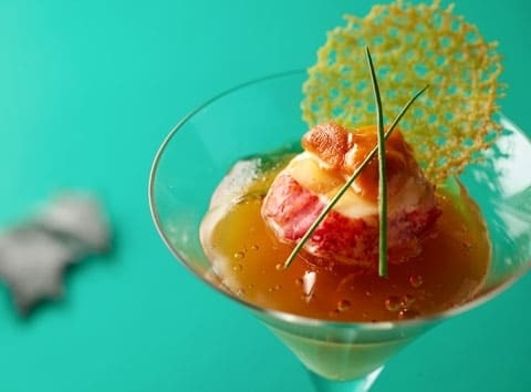 カクテルグラスに盛られた見た目にも豪華な冷前菜「帆立貝とオマール海老のコンソメジュレ セロリラヴのムース ウニ飾り」は、帆立貝とスライスしたオマール海老、ウニがトッピングされた贅沢な一品です。