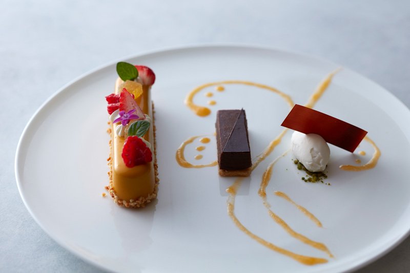 世界のトップパティシエに愛されるフランス産ヴァローナ社のスイートチョコレートとミルクチョコレートを使い、パイナップルのコンカッセとゼリーをミルクチョコレートのムースで包んだケーキと、クッキー生地を敷いた生チョコとバニラアイスを添えた、パイナップルの酸味とチョコレート甘みのバランスが絶妙なスイーツセレクションです。
