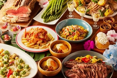 夏の日差しが差し込む南国リゾートのような空間で「ガーリックシュリンプ」や「アヒポキ」といったハワイの定番メニューがお楽しみいただけるランチブッフェと、ナイトプールの入場券がセットになったプランです。