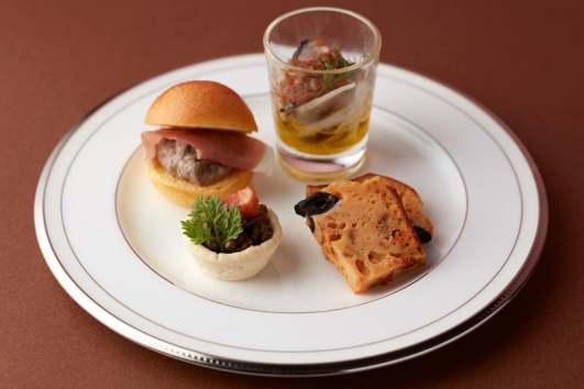 茸のデュクセルと生ハムのミニバーガー/豚バラとレンズマメのタルト/ドライトマトとオリーブのケーキサレ/鰹と玉葱のマリネ エシャロットソース