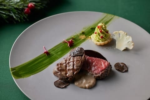 タスマニアサーモンに赤アンディーブのピクルスを添えてクリスマスカラーに仕上げた一皿や、芳醇な香りのオマール海老のスープ、生ベーコンで巻いた鮟鱇のほか、メインには鹿児島県産黒牛のグリルが登場。