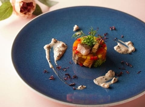 前菜には、春に旬を迎える鰹と、彩り鮮やかな春野菜をコンソメゼリーに閉じ込めたアスピックゼリーをはじめとする、季節感溢れるメニューを週替わりでご用意します。
