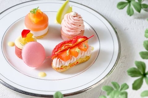 桃風味のフィナンシェと桃クリームを合わせた「桃のモンブラン」や、赤桃クリームとカスタードクリーム、桃のコンポートをサンドした「エクレアペーシュ」、紅茶タルトの土台にチーズクリームと桃のコンポートをのせた「紅茶風味の桃タルト」などが登場します。