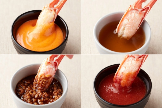 ・トゲズワイ蟹の食べ放題 4種のソース(シラチャー、蟹酢、醤油麹のソース、カクテルソース)