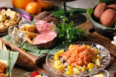 シェフサービスでは、GARDEN DINING定番のオーストラリア産サーロインのローストビーフや、国産牛のビーフステーキのほか、エビの出汁が効いたさっぱりとした味わいのスープと滑らかな麺が特徴の「ハワイアンサイミン」を提供いたします。お好みの具材でアレンジを加えてお楽しみください。