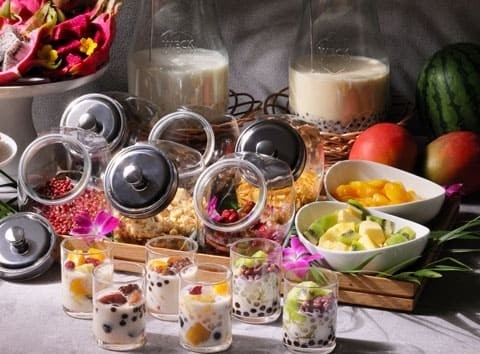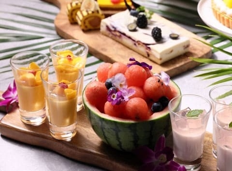 濃厚な甘みととろけるような口当たりが味わえる4種類のマンゴーを取り揃え、一つひとつ異なる味わいを心ゆくまで食べ比べていただけます。さらに、夏を感じる華やかな色合いの「マンゴータルト」や、ライチのみずみずしさが爽やかに引き立つ「マンゴーとライチのムース」など、リゾート気分を彩る華やかなデザートが勢揃い。シェフサービスでは、フルーツを贅沢に使用し、ココナツミルクやタピオカやゼリーなどお好みでトッピングができる、ベトナムの伝統スイーツ「チェー」をお楽しみいただけます。