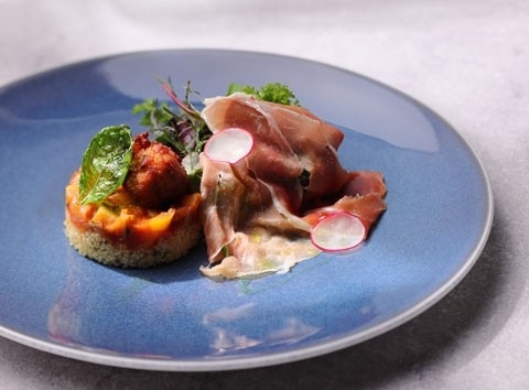 | 白身魚と夏野菜のテリーヌ サフランマヨネーズ |
