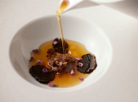 | タラバ蟹と旬の魚介のグリル ビスクエスプーマ |
