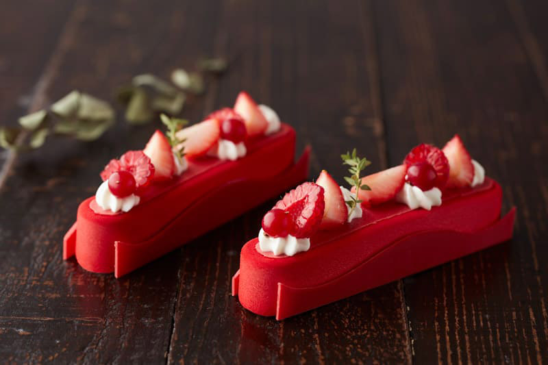 ピスタチオの生地に赤いチョコレートを吹き付け、外側をあまおうのムースで包んだ真っ赤なスイーツです。中はあまおうのゼリーとピスタチオのムースの2層構造になっています。