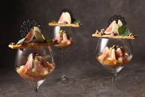 下の層には香り高い紅茶のジュレと、りんごのコンポートを敷き、その上に、滑らかなチョコレートアイスクリームと、甘くみずみずしい無花果を重ねました。さらに、青森県産のアップルブランデーを加えることで、果実の甘みと香りに奥行きを持たせています。グラスの上には、無花果の果実とりんごをあしらった香ばしいパイ生地を飾り、食感に軽やかなアクセントを添えました。目にも美しいその佇まいとともに、季節の趣を写した、味わい深い一品に仕上げました。