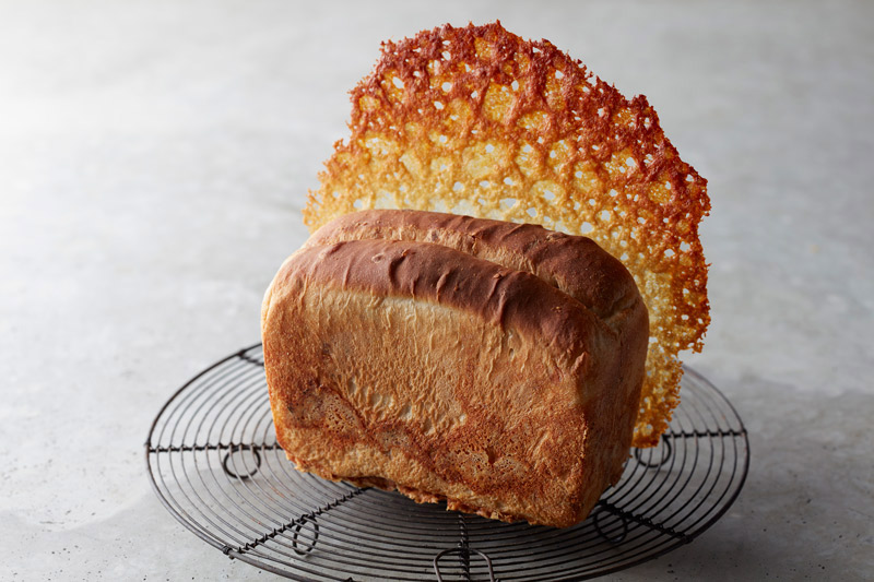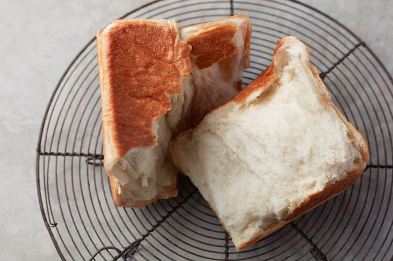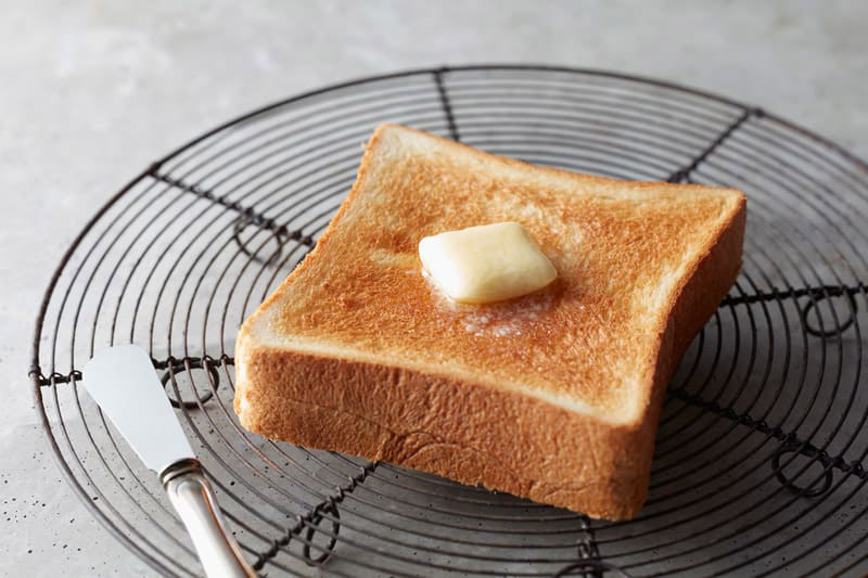 北海道産の小麦粉、牛乳、バター、高級たまごを使用した、素材にこだわった食パンです。生地は低温で長時間発酵させ、焼き上げているため、水分の含みがよく、しっとりとした食感に仕上がっています。片面のみを焼いて、しっとり感とサクサク感をどちらも味わう楽しみ方がおすすめです。