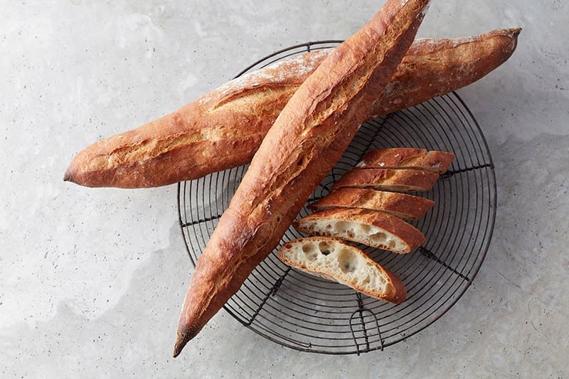 ミキサーを使わず、最小限の手ごねだけで仕上げた、もっちりとした食感のバゲットです。通常仕込みから5時間で焼き上げるところを、24時間かけて長時間熟成させているため、気泡がしっかり入っており、小麦粉のうまみと香ばしさを味わうことができます。