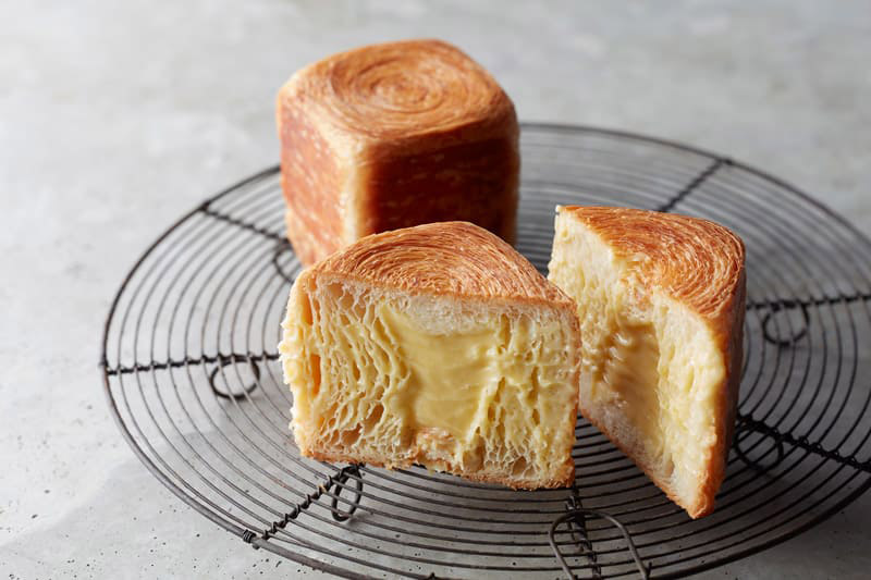 バターたっぷりのサクサクの生地とバターを幾層にも重ね、きれいな渦巻き模様を作り、ビジュアルにこだわったデニッシュクリームパンです。キューブ型で、中にデニッシュとよく合うカスタードクリームが入っています。