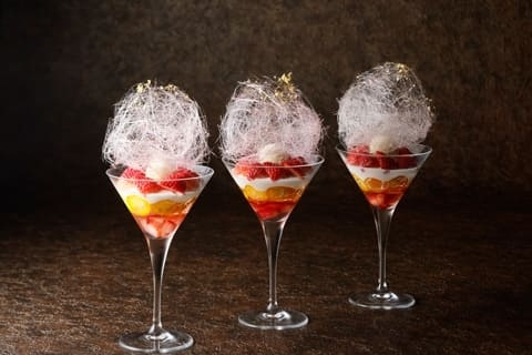 1・2月に登場する『大人のいちごパフェ』は、いちご本来の香りと瑞々しさを閉じ込めたジュレをベースに、フレッシュないちご、優雅な白ワイン風味の金柑のコンポートを重ねた、冬ならではの華やかな一品です。中央にはバニラアイス、仕上げには繊細にきらめく飴細工と金箔を纏わせました。