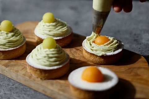 厳選したメロン4種の食べ比べのほか、白桃や柑橘などの旬のフルーツを使用した、爽やかな味わいのデザートも揃えました。目の前でデザートの仕上げを行うシェフサービスでは、タルト生地にとろけるような口当たりのディプロマットクリームとアーモンドクリームを絞り、メロン風味のシャンティークリームを重ねた、出来立ての「メロンタルトモンブラン」をご提供します。