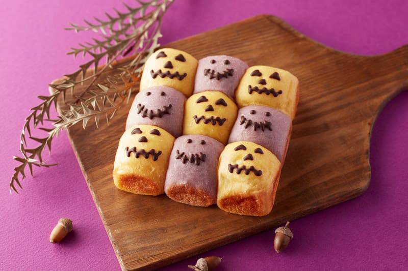 2種類の生地を交互にして型に入れ焼き上げたパンです。黄色の方にはかぼちゃクリーム、紫の方には紫芋クリームが入っており、生地にもそれぞれかぼちゃと紫芋のペーストとパウダーを練り込んでいます。小さくちぎれるため、お子様でも召し上がりやすく、シェアしてお楽しみいただけます。