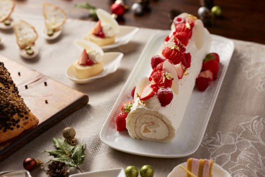 デザートのメインはクリスマスの定番「ブッシュ・ド・ノエル」。白い生クリームと赤い苺のロマンチックな色合いが、テーブルを華やかに彩ります。