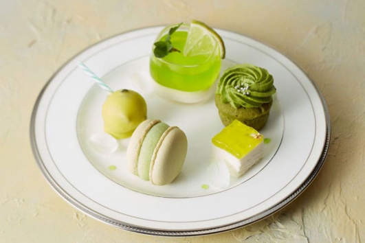 メロンのマカロン/白桃のブランマンジェ モヒート仕立て/ピスタチオのガトー/抹茶のカップケーキ/イムとホワイトチョコレートのムース
