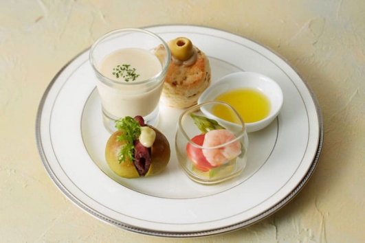オリーブのスコーン/アスパラガスと小海老のマリネ/コールドビーフのサンドイッチ/ジャガイモのヴルーテ