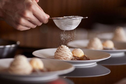 中でも、ご注文をいただいてから目の前で仕上げる「モンブランのエスプーマ仕立て」は、高級ブランデーのコニャックを使用し、贅沢な大人の味わいに仕上げました。クリームはエスプーマ手法を用いており、やわらかく優しい口当たりのモンブランをお楽しみいただけます。