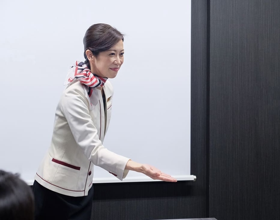 講師が、現場のエピソードを交えながら JAL のおもてなしの心をベースにした経験談やマナー基礎を講演形式でお届けします。