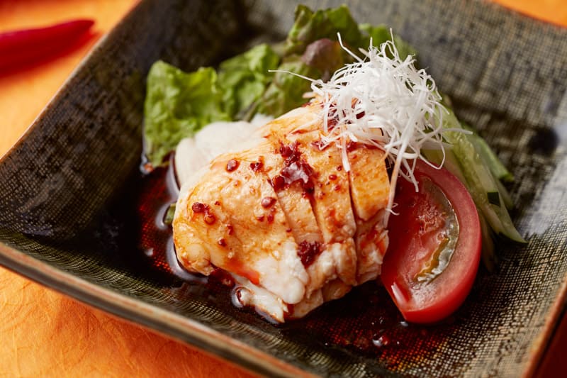 茹でた鶏肉に豆板醤やラー油、花椒などで作った辛いタレをかけた料理です。シビれる辛さがクセになる一品です。