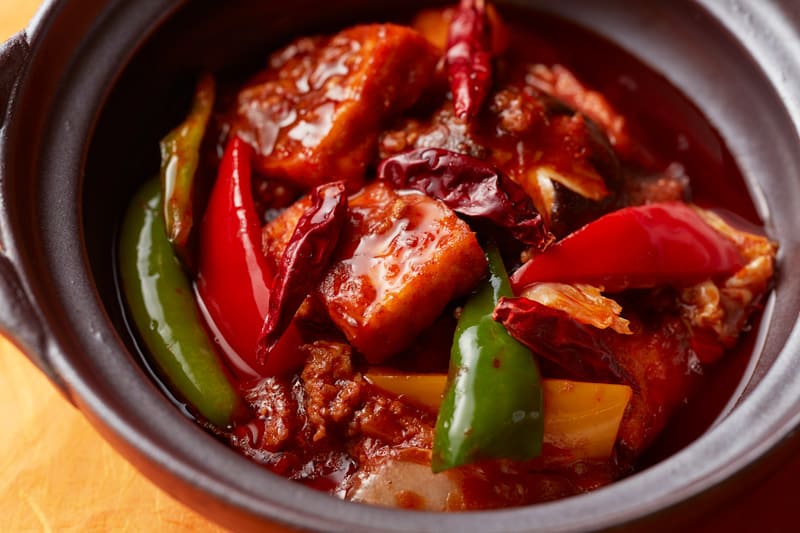 肉や野菜を唐辛子や花椒と一緒に土鍋でしっかり煮込んだ麻辣豆腐です。