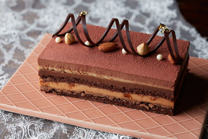 チョコレートムース、バナナクリーム、コーヒーガナッシュ、ジョコンドショコラ、プラリネクリーム、フィヤンティーヌなど幾層にも重ねたハーモニーが絶妙なケーキです。