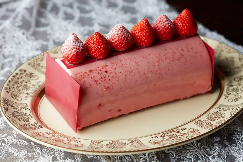 ジャスミン茶の香りをつけたムースの中にいちごのゼリーといちごのクリームを入れた、断面も美しい一品です。
