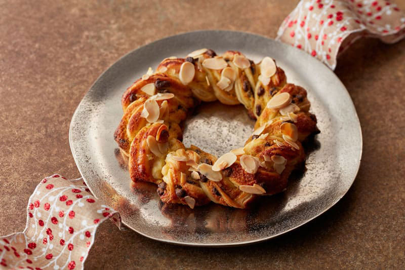 ピスタチオクリームとチョコチップを包んだデニッシュをリース型に焼き上げました。
