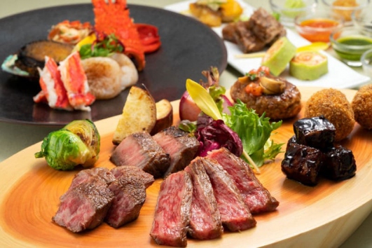 和王サーロイン鉄板焼/和王フィレ鉄板焼/和王モモ肉の塩麹焼/ 和牛しぐれ煮入りガーリックライス/和王のローストビーフ/ サーモンとチーズのロール仕立て/白身魚のエスカベーシュ/ 焼きタラバガニ キャビア添え/和王の煮疑り/トリュフ入りマッシュポテト