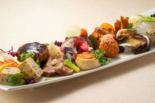 サーモンマリネ イクラのヴィネグレット/特大帆立貝柱のグリル キャビア添え/雲丹のフラン/ズワイガニのクリームコロッケ/フォアグラテリーヌ 季節のコンポート添え/イベリコ豚の揚げラビオリ/国産牛ローストビーフ マスタードソース/季節野菜のグレッグ