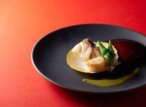 | マハタと月日貝のポワレ 知覧茶のクリームソース |