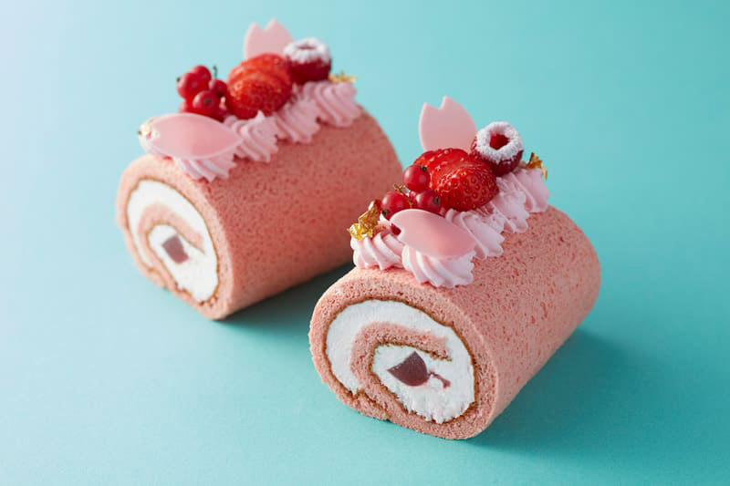 見た目でも味わいでも春を感じられるロールケーキです。しっとりと焼き上げた桜のスポンジ生地に、桜の風味をつけたシャンティークリームと桜のゼリー、酸味のある苺とルバーブのジャムをアクセントに入れて巻き上げました。