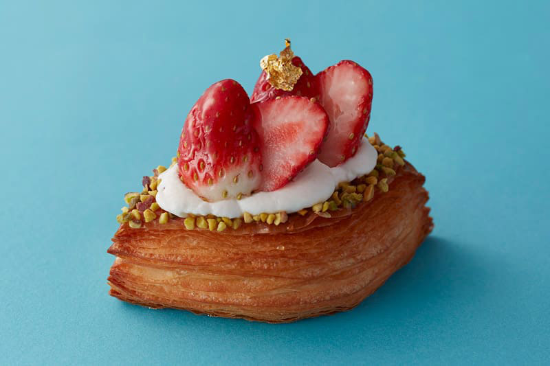 リーフ型のデニッシュ生地に、フレッシュないちごと、練乳を使用した自家製のミルクバタークリームを合わせました。アクセントにピスタチオをあしらっており、赤と緑のコントラストが可愛らしい見た目にも楽しめる一品です。