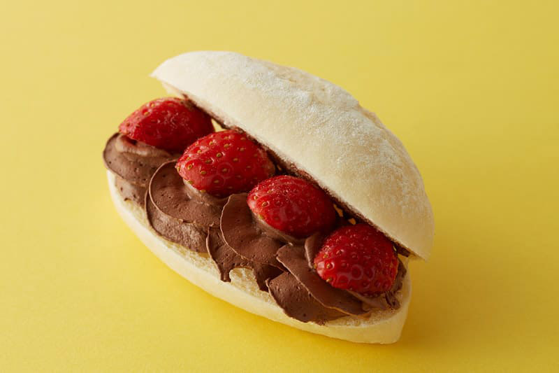 ふわふわの白パンにチョコレートクリームとフレッシュないちごを挟みました。