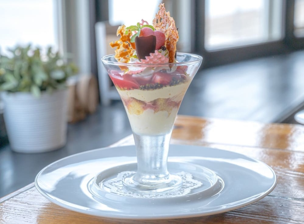 アルコールが香る奥行きのある構成は、まさに“大人のご褒美”。夜景を眺めながらゆっくりと味わいたい、贅沢な時間を約束してくれるパフェです。