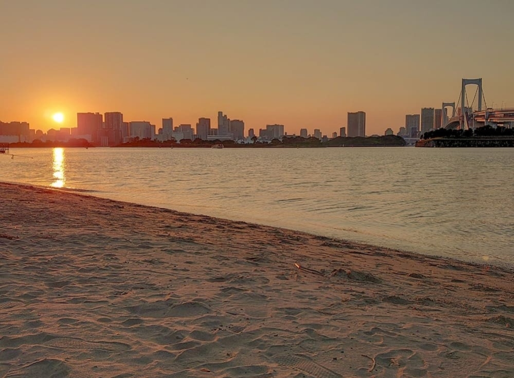 東京湾の穏やかな波とレインボーブリッジ、そして対岸の東京タワーまで見える贅沢な構図は、まさにお台場サンセットの代名詞。海辺に腰を下ろしてのんびりと夕日を待つ時間は格別で、カップルはもちろん、一人で静かに過ごしたい時にもぴったりです。
