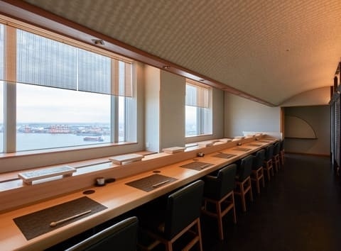 店内の大きな窓からは、皇居の緑や丸の内の高層ビル群を一望でき、東京の中心地らしい景色を背景に、職人の握る本格寿司を堪能できます。