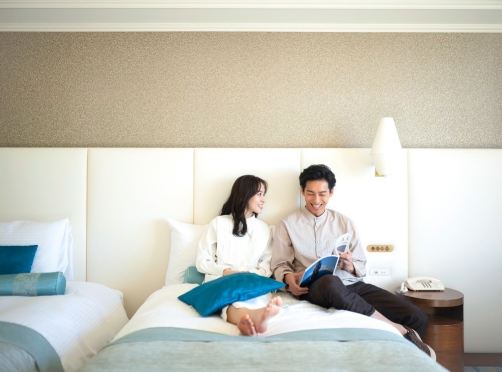 砂浜の近くに建つヴィラやコテージをイメージした“Shore Breeze”をコンセプトに、リゾートを思わせる解放感のある客室。