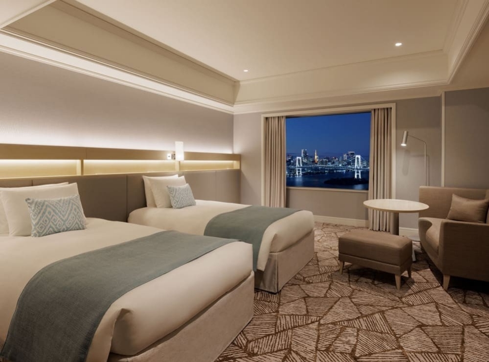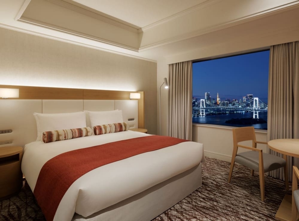 レインボーブリッジが見える客室や大井ふ頭のオレンジ色に染まる夜景など、都心の高層ビルの合間から見える景色とは異なるお台場ならではの解放感と躍動感にあふれる眺望が広がります。