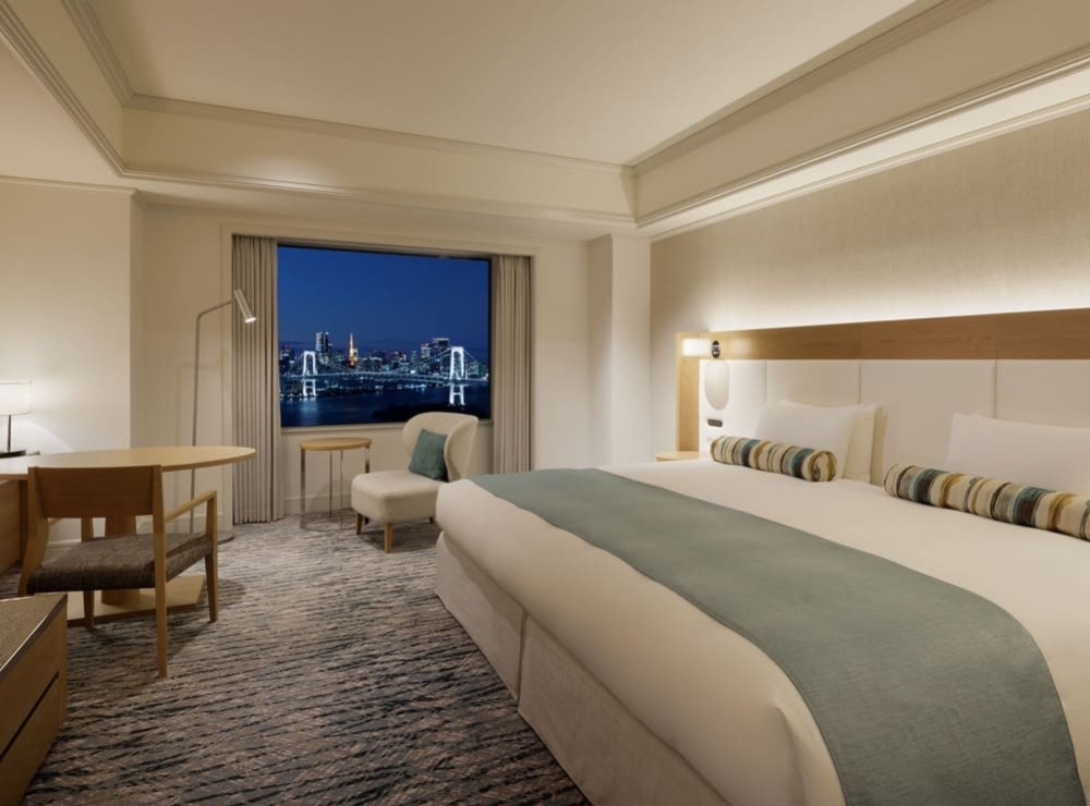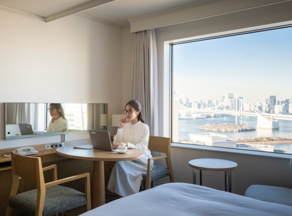 レインボーブリッジが見える客室や大井ふ頭のオレンジ色に染まる夜景など、都心の高層ビルの合間から見える景色とは異なるお台場ならではの解放感と躍動感にあふれる眺望が広がります。