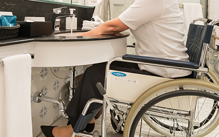 採用保留洗面盆(盥洗室)下方空間的規格,方便輪椅使用者使用。